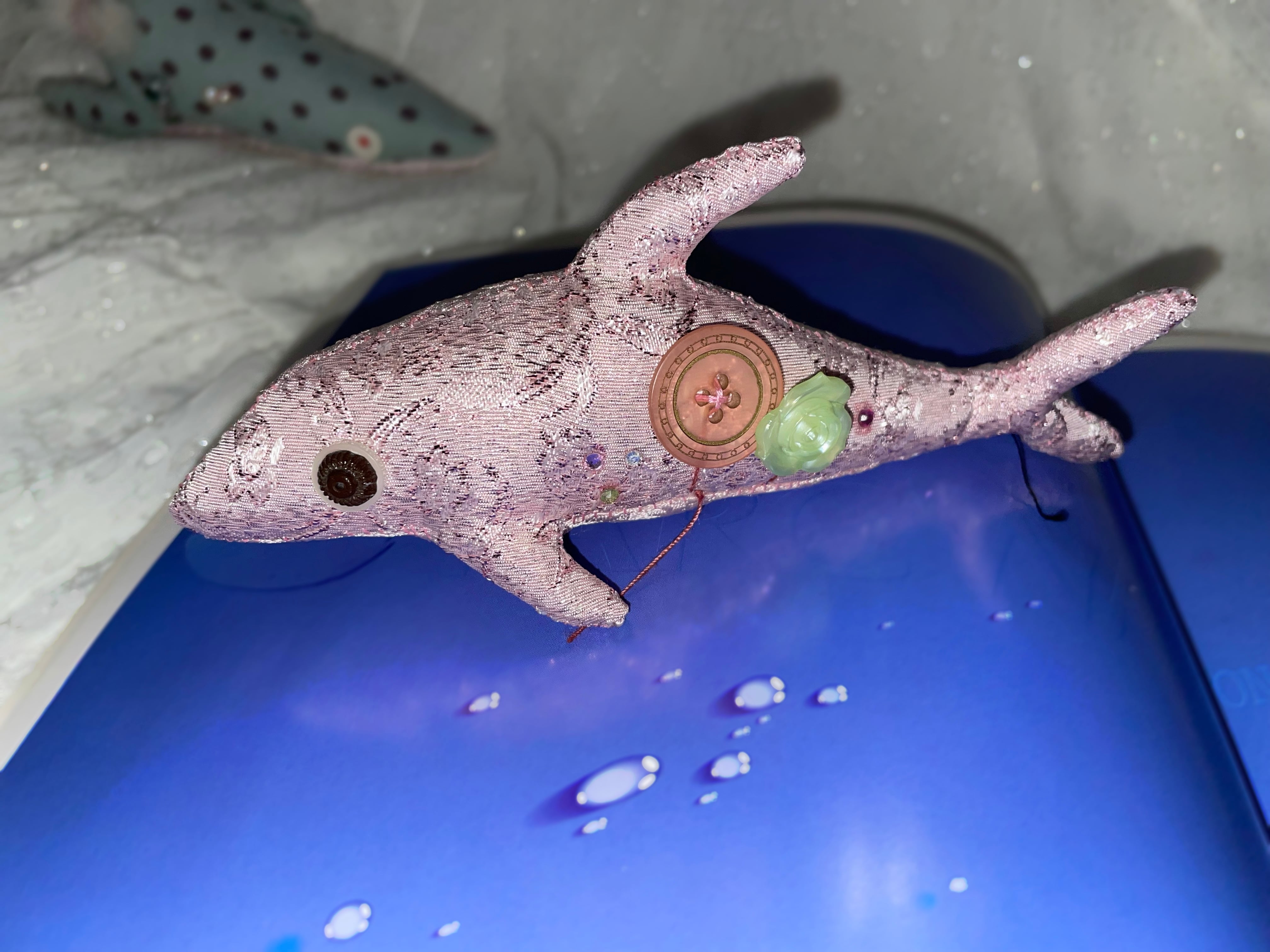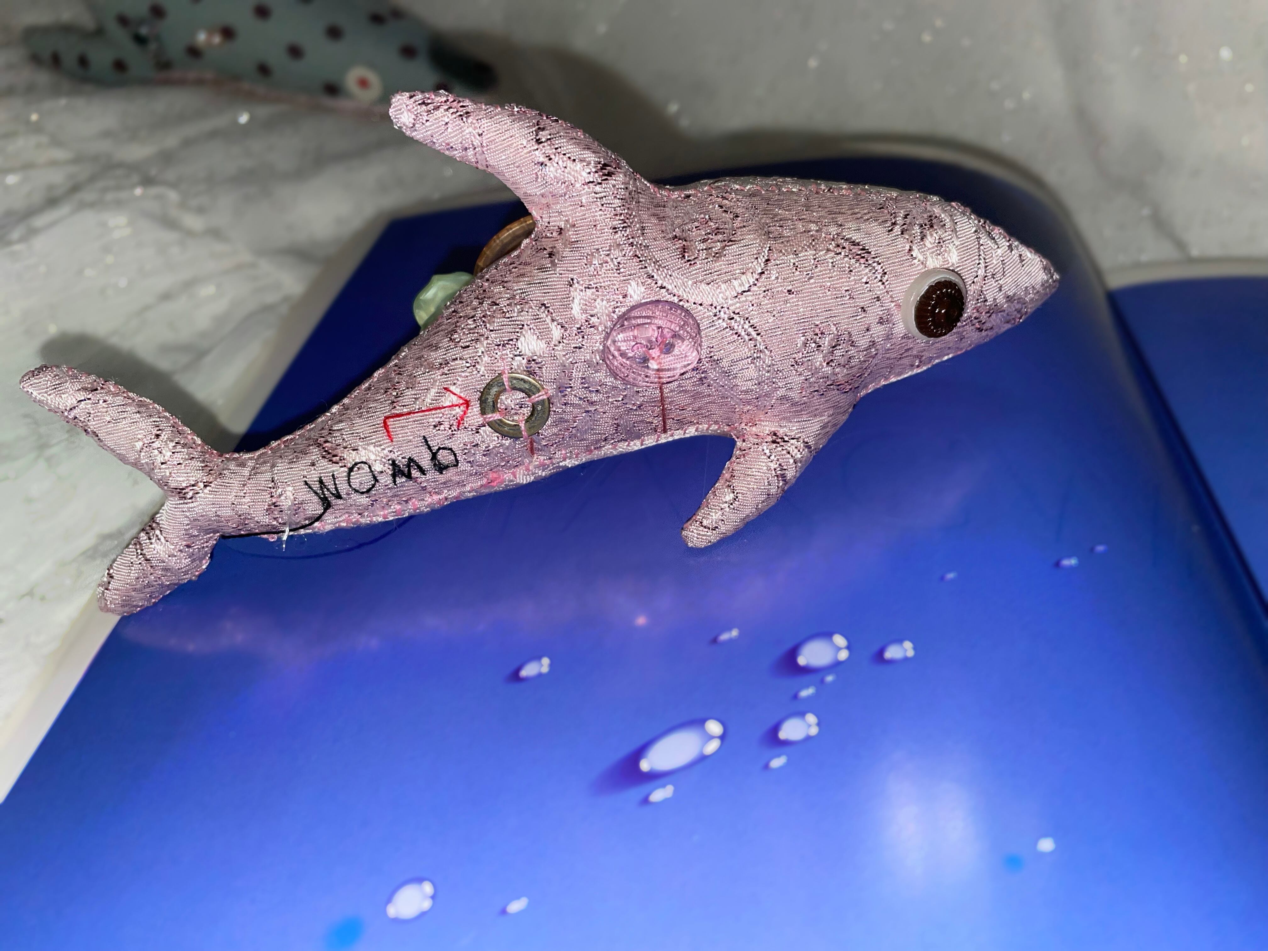 肉イルカ(こども)。体長約16㎝(前回書き忘れてすみません)。子宮があるのでメスです!最初はかわいいピンクでお花イルカかな?と思ったけど、完成したら肉だった。すべて手縫いのためビーズなどちょっと取れやすいです(注意)。(優しく扱ってあげて)