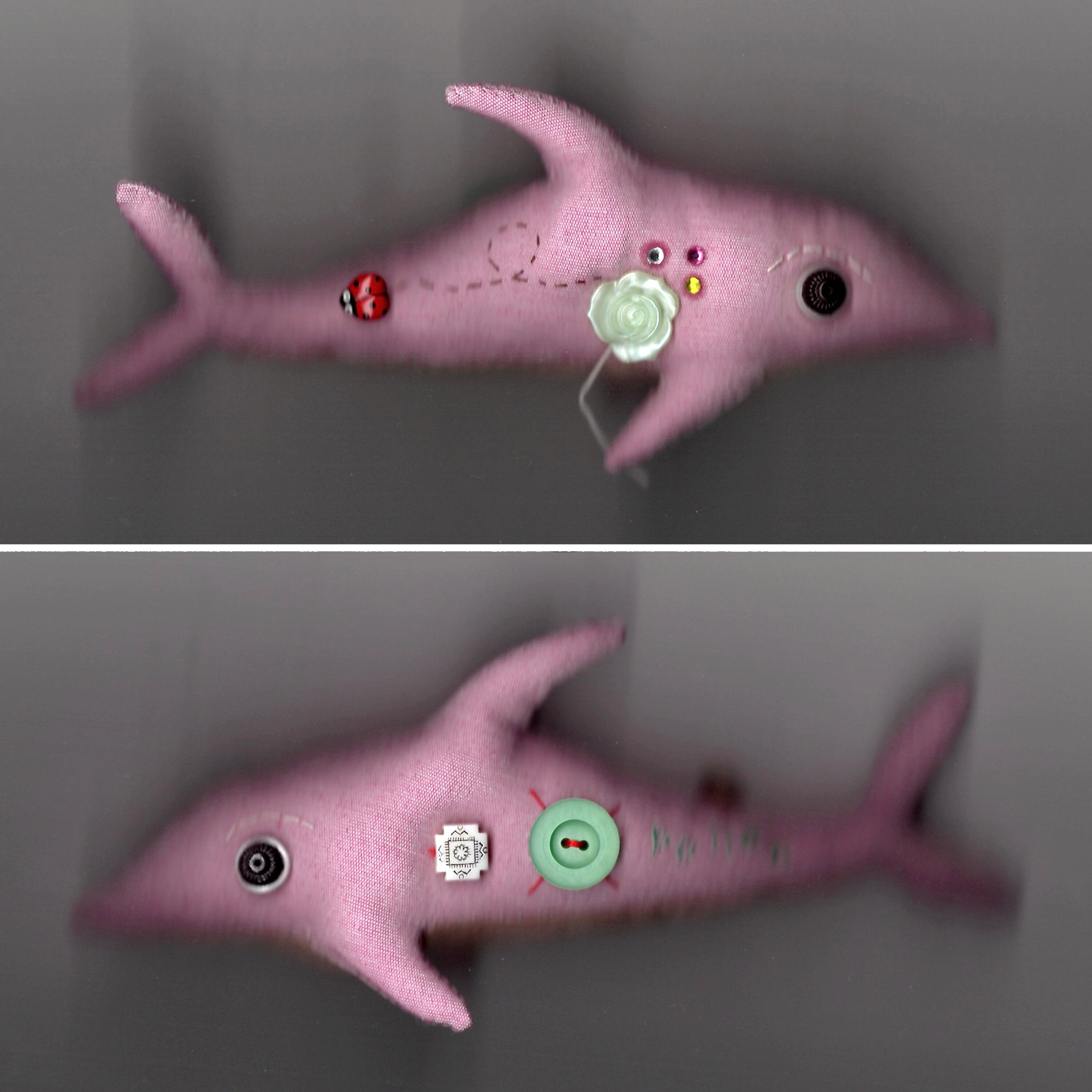 花粉イルカ(こども)。体長約16㎝(前回書き忘れてすみません)。眉毛あり(レア!)。この季節は間違いなく花粉が1番の嫌われ者かと思いますが、コイツのことは嫌いにならないでください。すべて手縫いのためビーズなどちょっと取れやすいです(注意)。(優しく扱ってあげて) ※ご購入の前にABOUT欄をご一読ください。